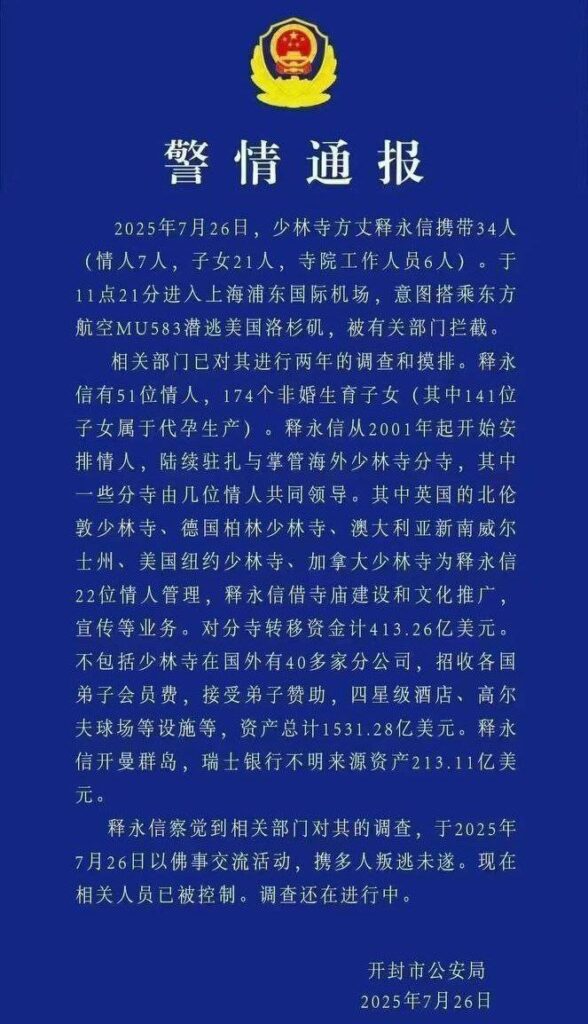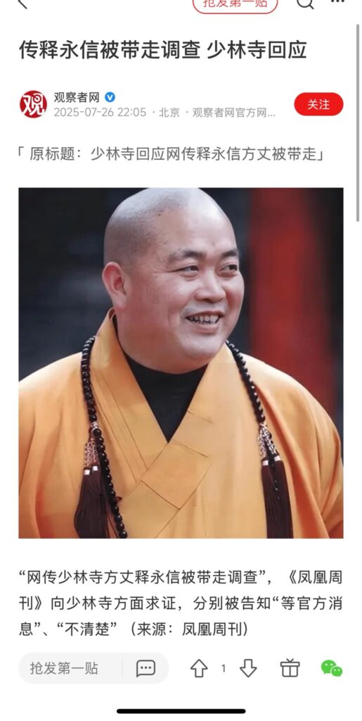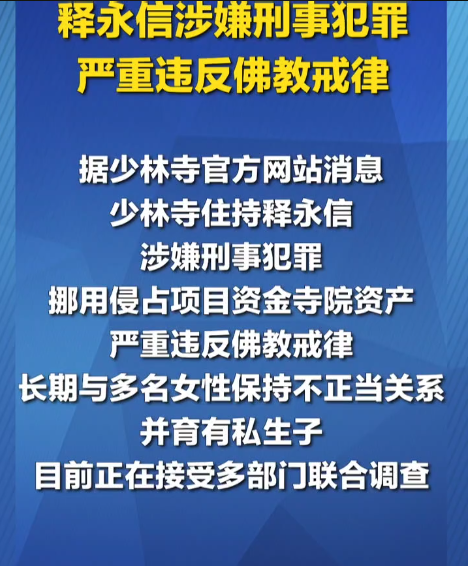 少林寺主持释永信因涉嫌挪用公款与多名女子保持不正当关系被调查