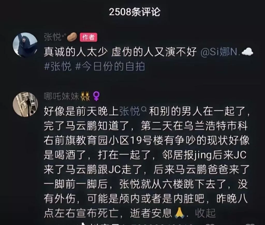 有网友曾在早先的评论里发现一些端倪,曝料出张悦出轨劈腿,疑似因感情问题导致惨剧。