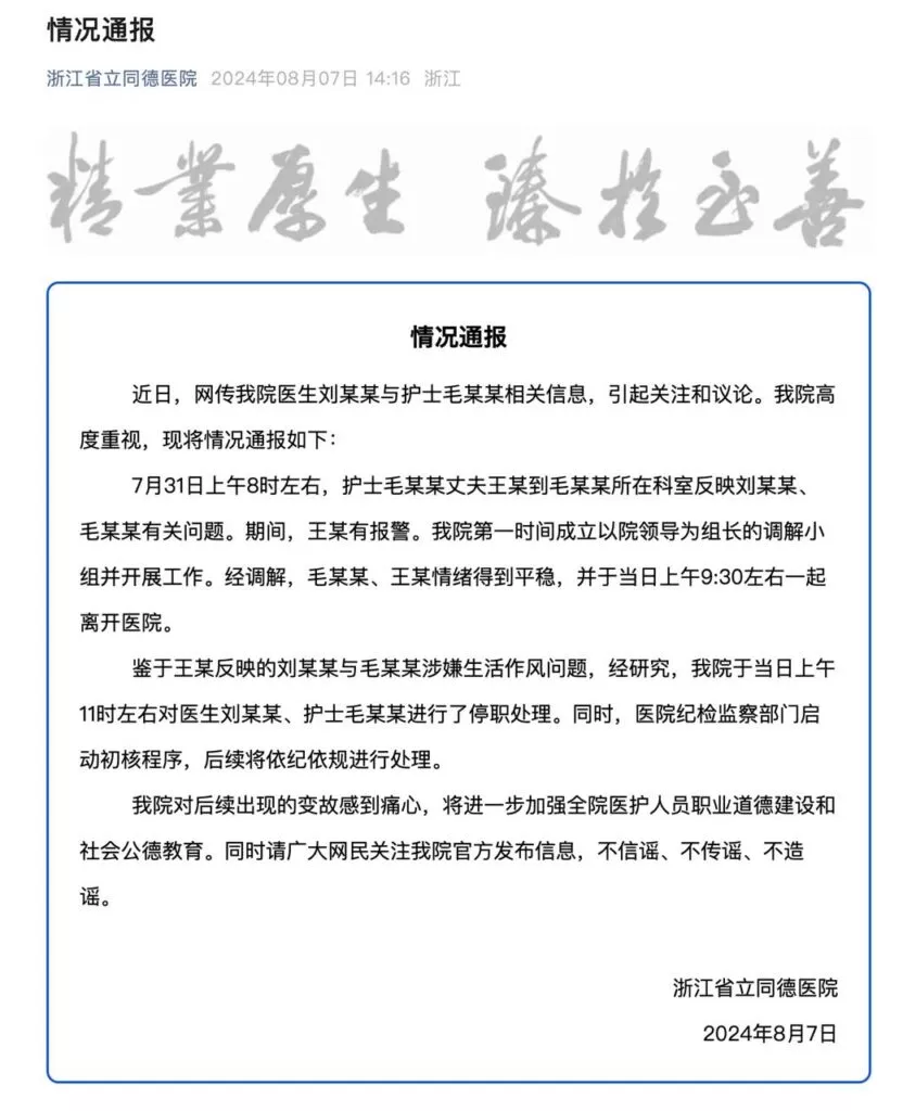 浙江杭州一位网友发文称,他的儿子王超曾向医院反映其妻子毛某与同事的不正当关系,结果却遭到嘲讽,心情沮丧的他最终选择自尽。事件曝光后,医院方面发布了情况通报,表示涉事的护士和医生已被暂停职务,并将依据相关规定进行处理。