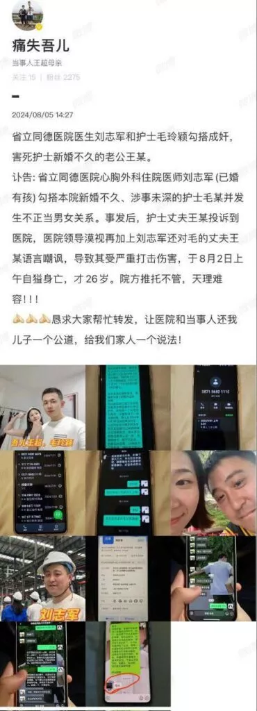 杭州男子王超因护士妻子毛颖玲出轨同院医生刘志军轻生