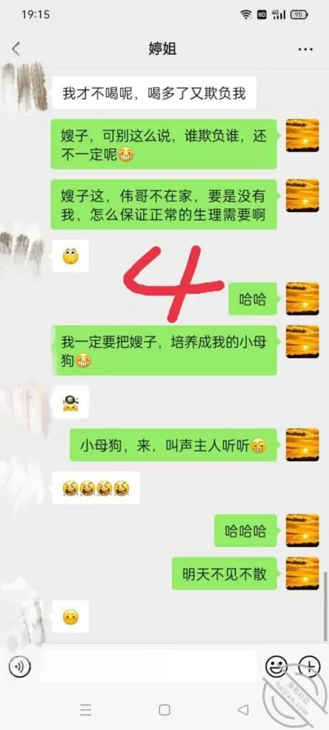 嫂子这个小母狗,真的是越来越大胆了,趁着国伟出去的时候居然与我调情,真的是搔啊,估计也是国伟回来,在床上没满足她,心里肯定不爽从聊天记录嫂子的语气中,不难看出,现在估计国伟在她心里,有没有都行了,在我这除了抱怨国伟,几乎就不说别的什么,估计在家里,跟国伟说的话,还不如跟我说的多呢,也是,谁让国伟满足不了自己的老婆呢,尤其是跟嫂子玩完SM,公厕,还有楼梯间后,现在我不光是拿下了嫂子的身体,也是征服了嫂子的心,这个小母狗其实内心就有一颗狂野的心,希望被人驯服,只是国伟没有开发出来!既然国伟没开发出来,只能是我来开发了,哈哈哈